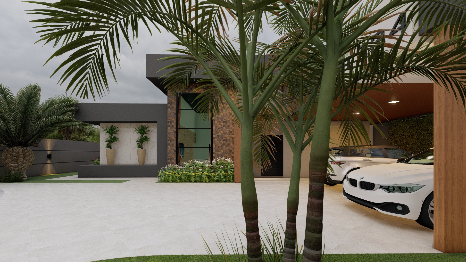 A garagem disposta no sentido horizontal se integra harmoniosamente ao corpo da edificação, reforçando o equilíbrio entre forma e função. O pergolado em madeira adiciona textura e aconchego ao conjunto, criando contraste elegante com os revestimentos neutros e o concreto aparente.